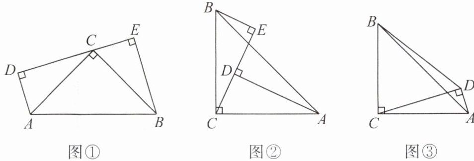 ②如图②,在等腰直角三角形$ABC$中,$\angle ACB = 90^{\circ}$,$AC = BC$,过点$C$作直线$CE$,过点$A$作$AD\perp CE$,垂足为$D$,过点$B$作$BE\perp CE$,垂足为$E$,$AD = 5$,$BE = 2$,则$DE$的长为