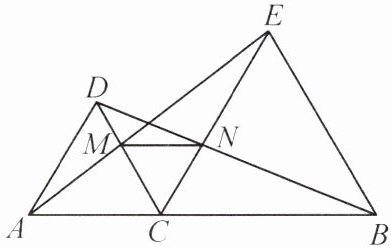 例 如图,点 C 是线段 AB 上任意一点(点 C 与点 A,B 不重合),分别以 AC,BC 为边在直线 AB 同侧作等边三角形 ACD 和等边三角形 BCE,连接 AE 与 CD 相交于点 M,连接 BD 与 CE 相交于点 N. 求证: