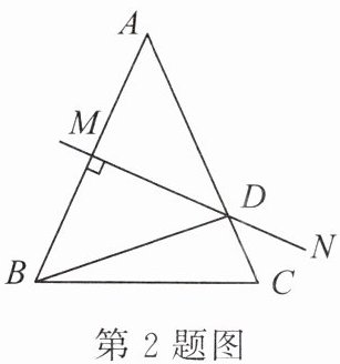 2. 如图,$∠C = ∠ABC = 65^{\circ}$,$AB$的垂直平分线$MN$交$AC$于点$D$,则$∠DBC$的度数为(