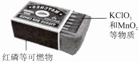 6. 氯酸钾$(KClO_3)$在二氧化锰作催化剂并加热的条件下,分解生成氯化钾和氧气。安全火柴梗头及火柴盒侧面的物质如图所示,当两者摩擦时,听到“嚓”一声,看到了火焰、白烟,这是因为生热点燃红磷,火柴梗(主要成分为碳)着火。