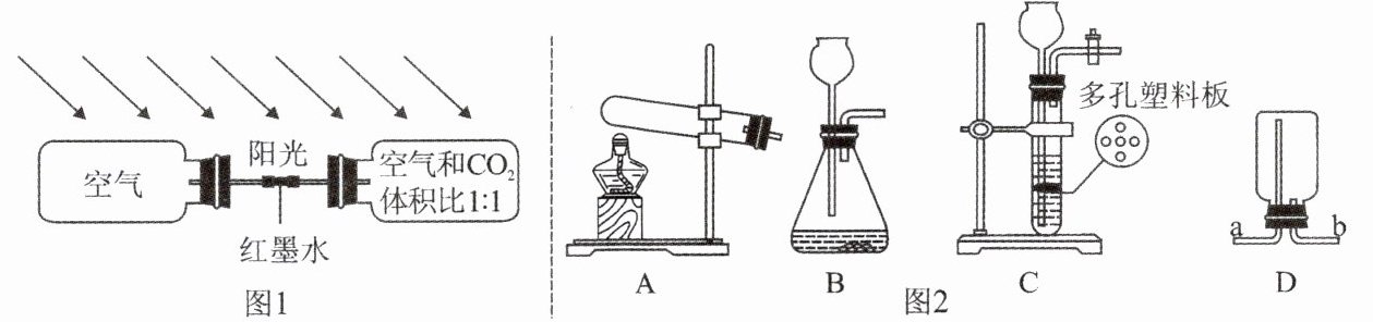 (1)图1是某化学兴趣小组设计实验验证二氧化碳造成温室效应的装置。他们选用体积相等的两个塑料瓶,分别盛满同条件下的空气、二氧化碳与空气的混合物(体积比1:1),并用一个小塑料管连接(在塑料管中间有一滴红墨水),置于阳光下。一段时间后红墨水滴会