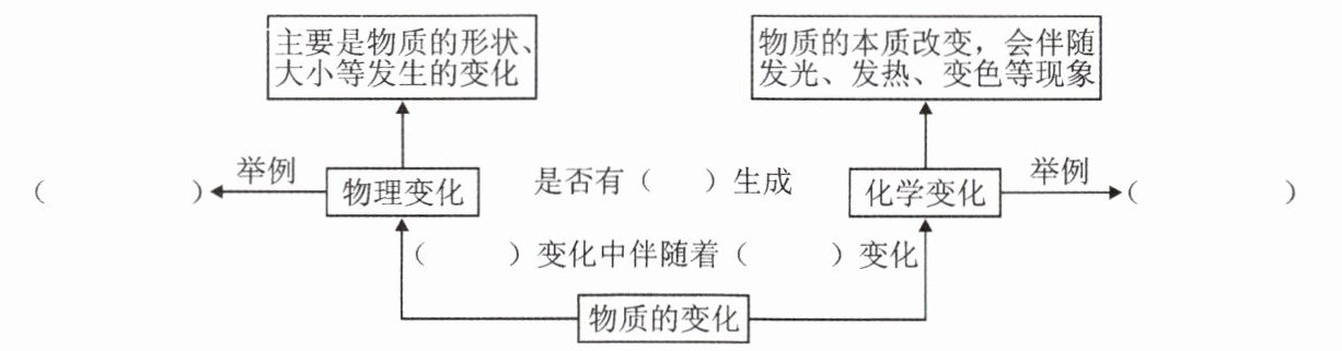物质的变化包括物理变化和化学变化,在化学变化中伴随着物理变化(如蜡烛燃烧是化学变化,燃烧过程中蜡烛熔化是物理变化),所以下面两个括号依次填“化学”“物理”。