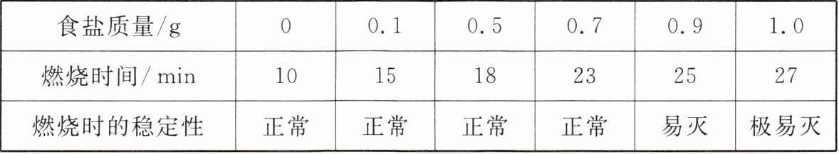 实验方案:取6支相同的蜡烛,在其中5支烛芯的周围分别放置不同量的食盐,另一支的烛芯周围不放食盐,作对照实验。分别测定它们的燃烧时间并观察燃烧时的稳定性,数据记录如表所示。