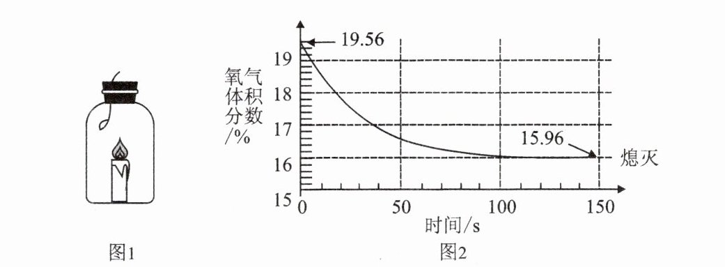 18. 新型传感器的使用使化学实验的数据采集更准确,并能在电脑上直观呈现出来。某兴趣小组的同学将氧气浓度传感器放入集气瓶内,点燃蜡烛后,在图1所示的密闭装置内燃烧至熄灭。用传感器采集的数据变化情况如图2所示。回答下面问题。