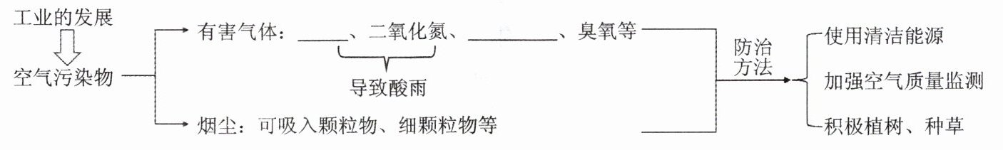 、臭氧等→导致酸雨;烟尘:可吸入颗粒物、细颗粒物等。防治方法:使用清洁能源、加强空气质量监测、积极植树、种草。