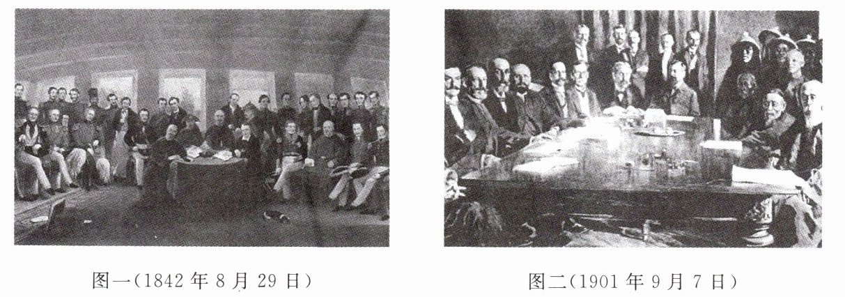 (1)图片一事件:中英《南京条约》的签订。图片二事件:《辛丑条约》的签订。影响:清政府成为帝国主义列强统治中国的工具,中国完全陷入半殖民地半封建社会的深渊。