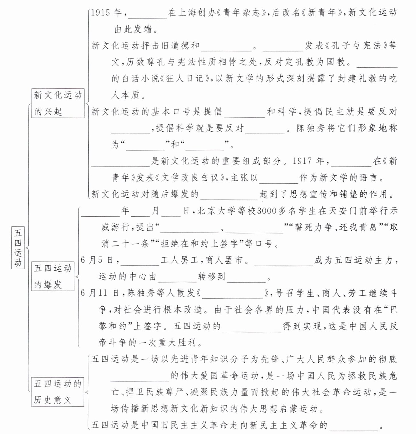 陈独秀;旧文化;李大钊;鲁迅;民主;专制;迷信;德先生;赛先生;文学革命;胡适;白话文;五四运动;1919;5;4;外争主权;内除国贼;上海;工人阶级;北京;上海;北京市民宣言;直接目标;反帝反封建;转折点