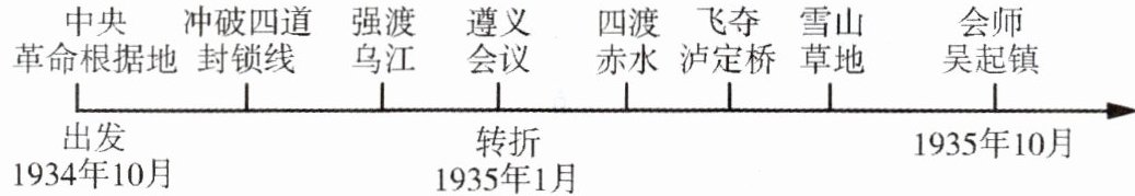 中央革命根据地出发(1934年10月)→冲破四道封锁线→强渡乌江→遵义会议(1935年1月,转折)→四渡赤水(打乱了敌人的“追剿”计划)→渡过金沙江(跳出了敌人的重重包围)→强渡大渡河→飞夺泸定桥→翻雪山、过草地→突破腊子口→进入甘肃→会师吴起镇(1935年10月)