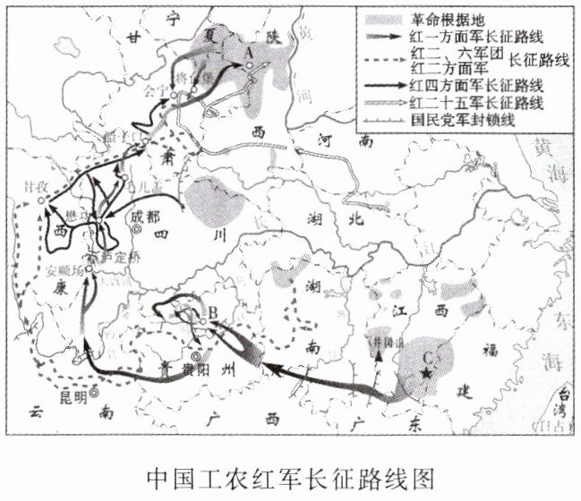 (1)①C:瑞金;②B:遵义;③A:吴起镇