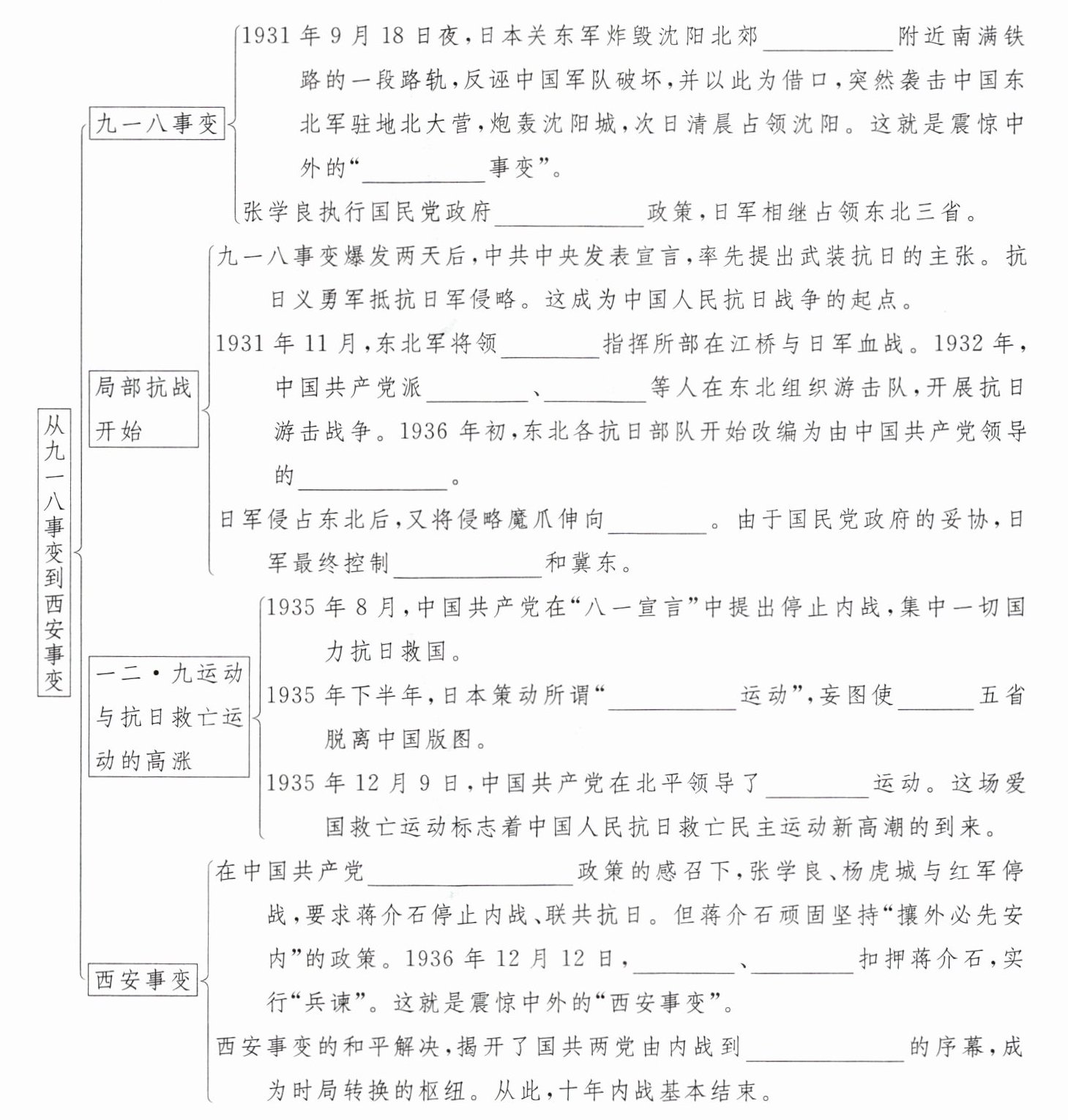 九一八事变:柳条湖;九一八;不抵抗 局部抗战开始:马占山;杨靖宇;赵尚志;东北抗日联军;华北;长城一线 一二·九运动与抗日救亡运动的高涨:华北自治;华北;一二·九 西安事变:抗日民族统一战线;张学良;杨虎城;联合抗日
