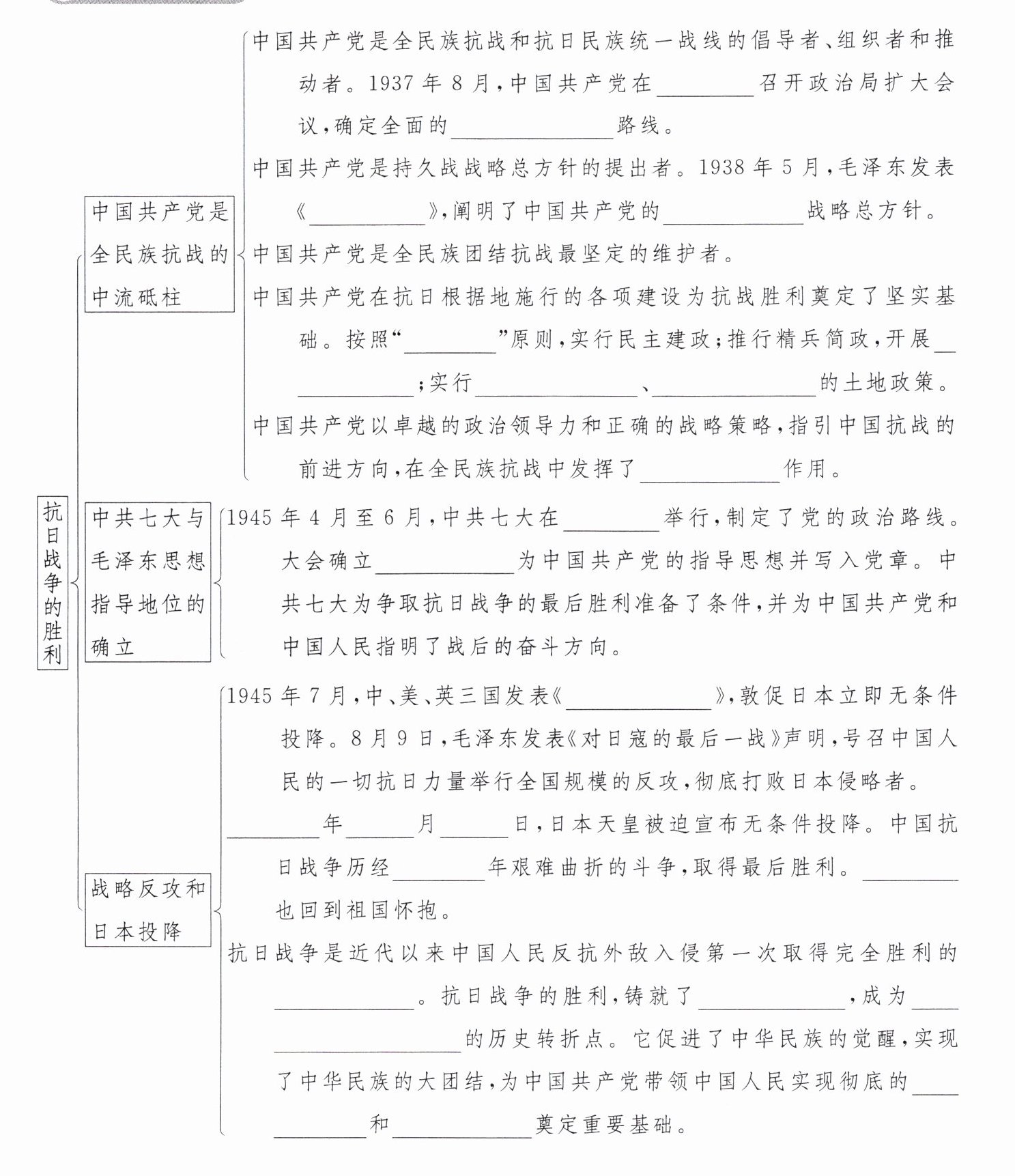 ______年______月______日,日本天皇被迫宣布无条件投降。中国抗日战争历经______年艰难曲折的斗争,取得最后胜利。______也回到祖国怀抱。