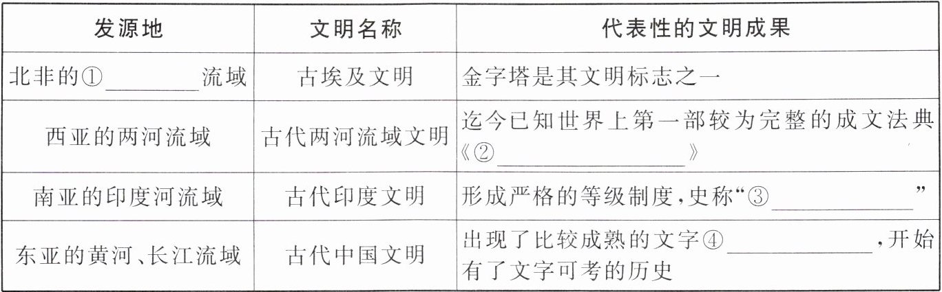 | 北非的①______流域 | 古埃及文明 | 金字塔是其文明标志之一 |