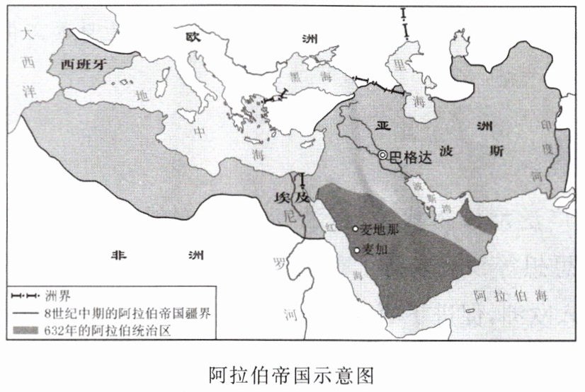 (1)至 8 世纪中期,阿拉伯帝国的版图横跨亚、欧、非三大洲,是当时世界上疆域最大的帝国。而且伴随着帝国的扩张,伊斯兰教向阿拉伯半岛以外的地区广泛传播。