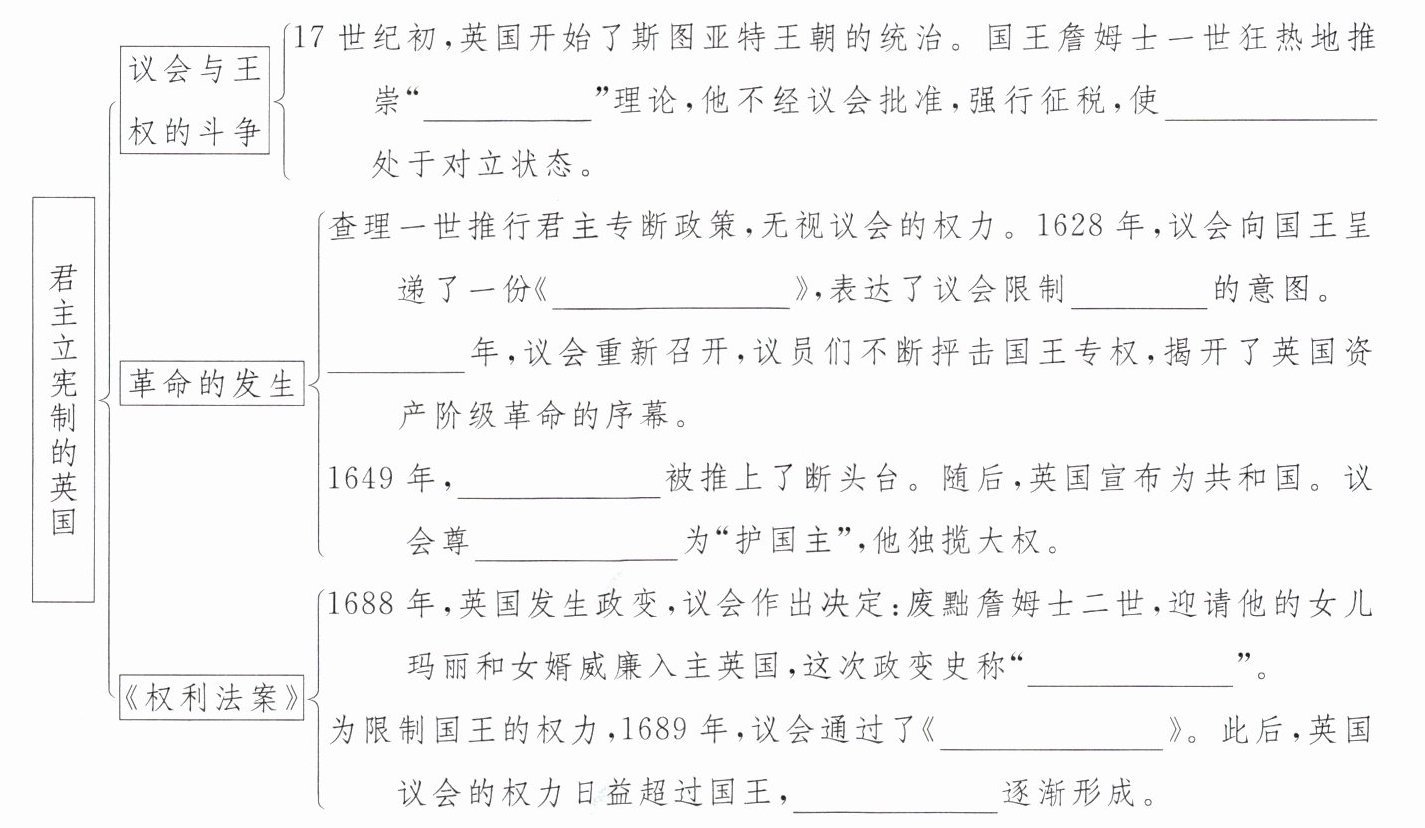为限制国王的权力,1689年,议会通过了《______》。此后,英国议会的权力日益超过国王,______逐渐形成。