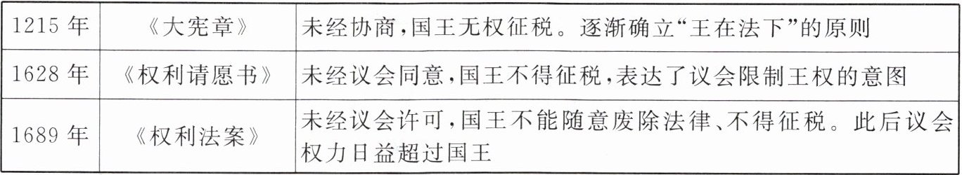 |1628年|《权利请愿书》|未经议会同意,国王不得征税,表达了议会限制王权的意图|