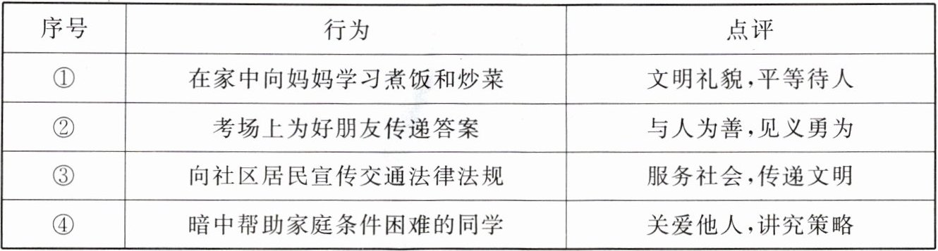 |②|考场上为好朋友传递答案|与人为善,见义勇为|