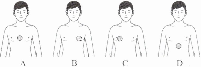 (2)当发现被救者无意识、无呼吸或呼吸异常时,可进行胸外心脏按压,胸外按压的正确部位为下图中的