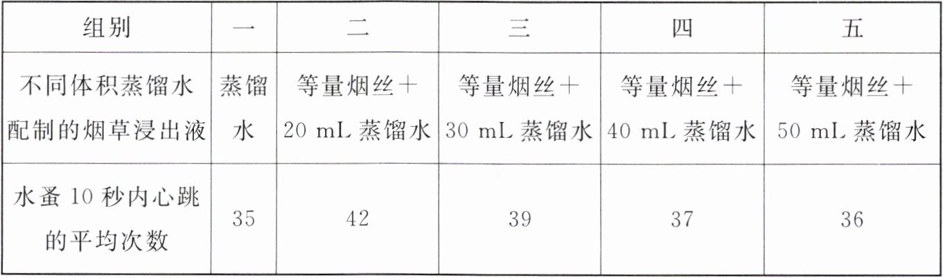 4. 某生物学科研小组在探究烟草浸出液对水蚤心率的影响时,测定了水蚤在不同浓度烟草浸出液中的心率,结果如下表。