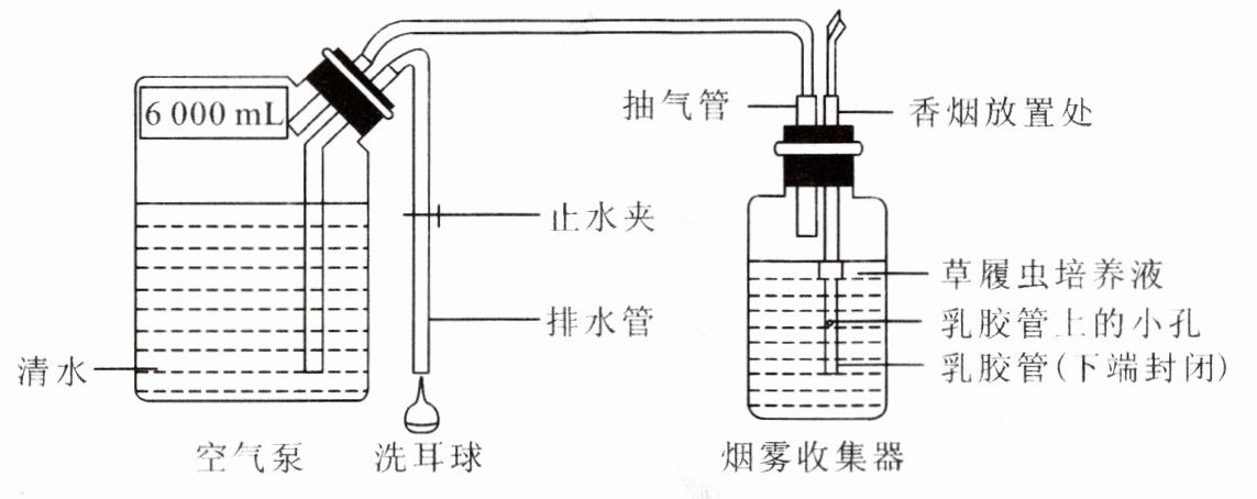 1. 为模拟观察香烟烟雾对气管的危害,某同学用如图所示的装置模拟吸烟动作:打开止水夹,用洗耳球抽取排水管中的空气,清水就会从排水管中持续流出,空气泵中的液面下降,烟雾就会持续进入烟雾收集器的培养液中。使用显微镜观察发现草履虫运动明显变慢,进一步观察发现其纤毛被香烟烟雾中的焦油黏结。下列有关该实验的说法,正确的是(