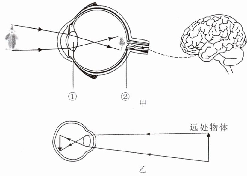7. 儿童青少年近视防控是全社会关注的热点。图甲是视觉形成过程的示意图,①②是眼球的局部结构。某些情况下,光经过角膜、晶状体等的折射后,物像会落在视网膜的前方,如图乙所示。请回答下列问题。