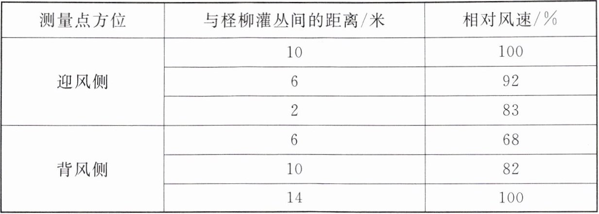 (3)研究人员对柽柳的防风固沙功能进行了野外观测,结果如下表所示。