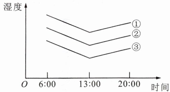 5. 某生物学兴趣小组在早、中、晚三个时间点,分别测定了不同地点的空气湿度,结果如图所示。请你判断,裸地、草地、树林所对应的曲线分别是(