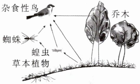 条食物链,其中最长的食物链是草本植物→蝗虫→蜘蛛→杂食性鸟