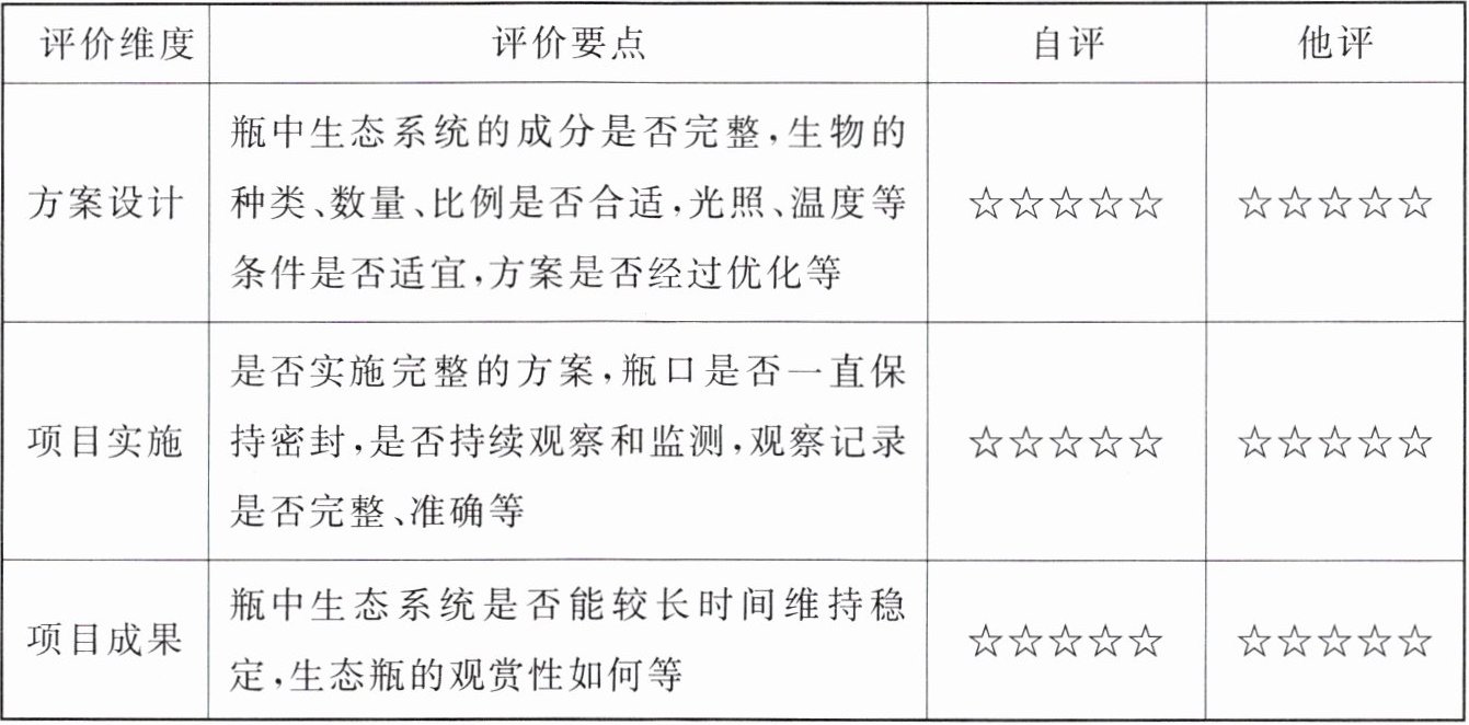 步骤一:1.小;非生物环境;透明;密封 2.种类;数量;温度;物质循环和能量流动;繁殖 步骤二:目标;内容;时间 步骤三:方案提示1.水生;2.小;强;食物链(或食物网);3.不用;4.透明 参考案例1.图解(或示意图);2.种类;数量;3.时间;4.密封(或用凡士林密封);5.散射光 步骤四:记录;措施;改进 步骤五:展示;汇报;评价;分享