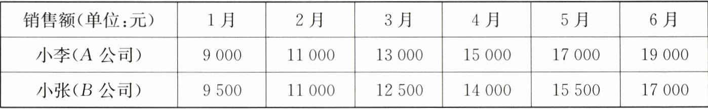 25. (6分)已知$A$,$B$两家销售公司员工工资的结算方式如下:$A$公司每月4000元基本工资,另加销售额的2%作为奖励性工资;$B$公司每月3600元基本工资,另加销售额的4%作为奖励性工资.已知$A$,$B$公司两位销售员小李、小张1~6月份的销售额如下表: