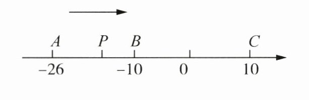 26. (6分)已知数轴上有$A$,$B$,$C$三点,分别表示有理数-26,-10,10,动点$P$从$A$出发,以每秒1个单位的速度向右移动,当$P$点运动到$C$点时运动停止,设