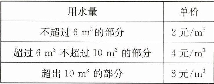 超过$6m^{3}$不超过$10m^{3}$的部分费用:$4×(10 - 6)=16$(元);