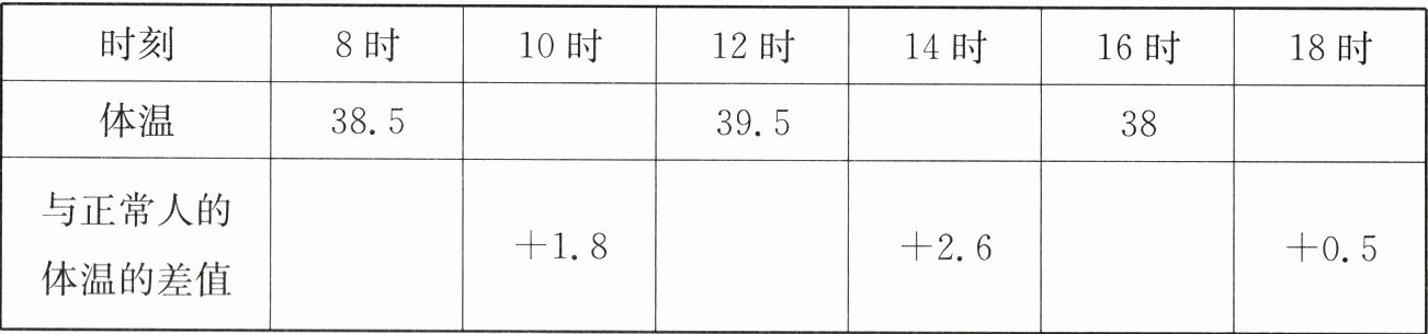 答:(1)填表见上述过程;(2)$14$时体温最高,$18$时体温最低;(3)该病人这一天的平均体温是$38.65^{\circ}C$。