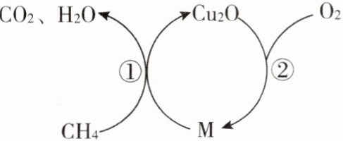 14. 一定质量的$CH_4$可与常见物质 M 反应,同时放出少量热量;将所得产物$Cu_2O$与$O_2$反应又生成 M,同时放出较多热量,其反应原理如图。下列说法正确的是 ()