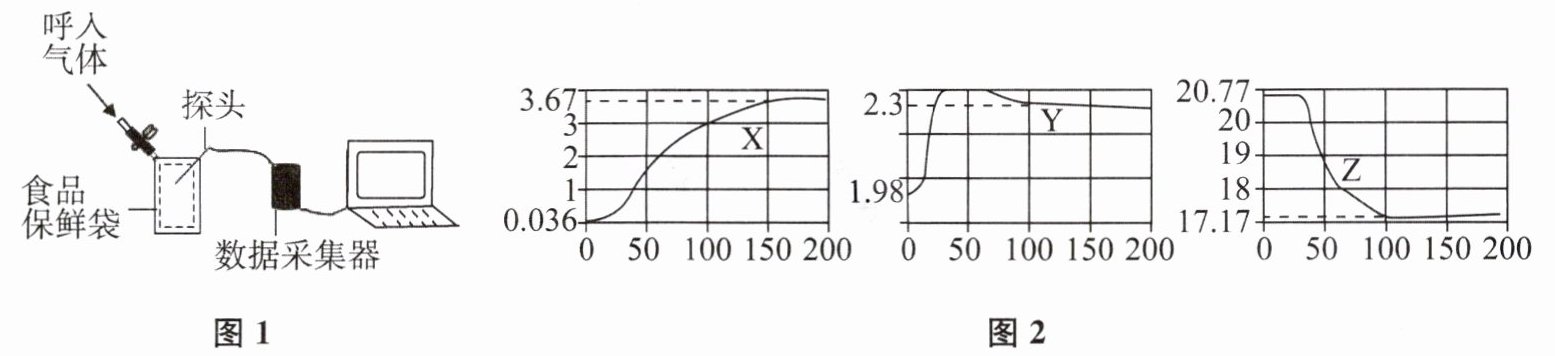 6. 如图1所示,向袋内缓缓吹气(袋内装有下雨天收集的空气样品),用传感器采集$\mathrm{O_2}$、$\mathrm{CO_2}$、湿度(测水蒸气)的相关数据如图2所示,纵坐标均为某气体体积分数(%),横坐标均为时间(s)。据图回答,下列说法