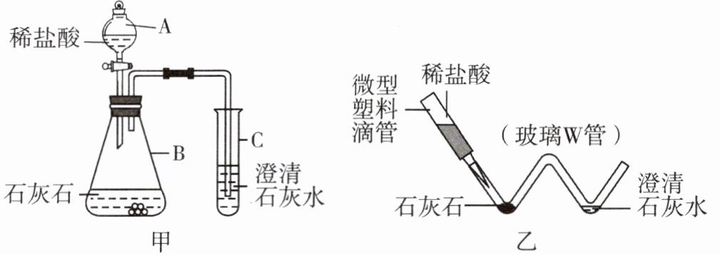 7. 化学实验提倡绿色环保,对实验装置进行微型化改进是一条很好的途径。图甲是实验室制取并检验$\mathrm{CO_2}$的装置,图乙是对图甲实验装置的“微型”化改进后的装置。请回答问题: