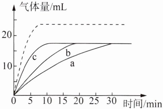 硫酸铜溶液也能作过氧化氢分解反应的催化剂,小组同学在常温下,向a、b、c三个试管中分别加入等量的5%的过氧化氢溶液,在其他条件相同时,各滴入2滴5%、10%、20%的硫酸铜溶液,绘制了产生氧气的体积和时间变化的曲线如图。