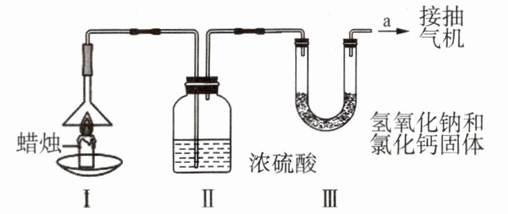 12. 为了测定蜡烛中碳、氢两种元素的质量比,某化学兴趣小组设计了如下图所示的实验。实验步骤如下:先分别称量装置Ⅰ中蜡烛、装置Ⅱ、装置Ⅲ的质量。按图示连接好仪器装置,点燃蜡烛,同时从$\mathrm{a}$导管抽气。一段时间后熄灭蜡烛,再分别称量装置Ⅰ中蜡烛、装置Ⅱ、装置Ⅲ的质量。(提示:浓硫酸只吸收水,氢氧化钠和氯化钙固体既可以吸收水分也可以吸收二氧化碳)实验数据如表。