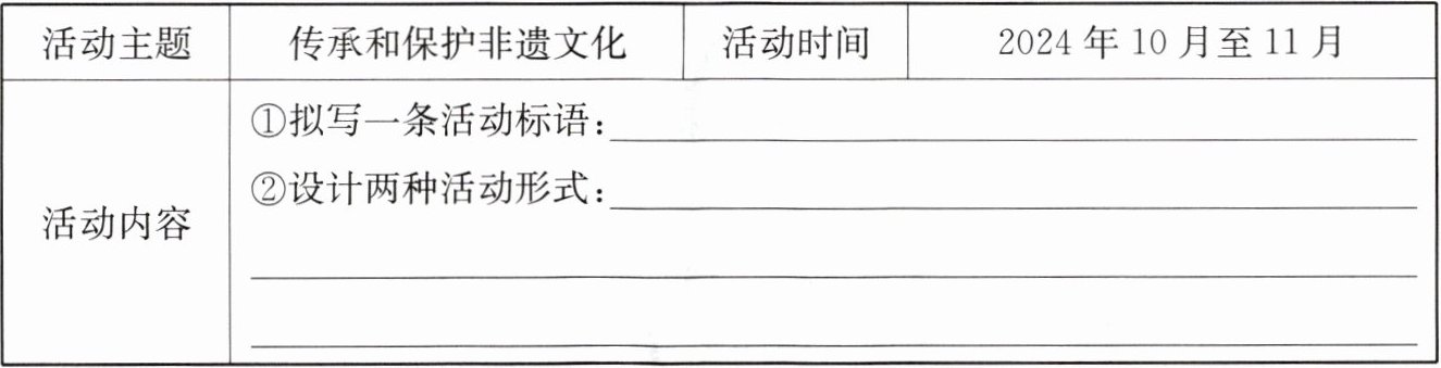 (3)①标语示例:助力非遗传承,贡献你我力量。(要求:紧扣活动主题,不得照抄活动主题)(2 分)②活动形式示例:举办非遗知识竞赛,开办非遗文化美术展、图片展,组织具有地方非遗元素的文创物品设计比赛,了解并讲好非遗故事,邀请非遗传承人开设讲座,等等。(每个 1 分,答出 2 个且言之有理可给分)