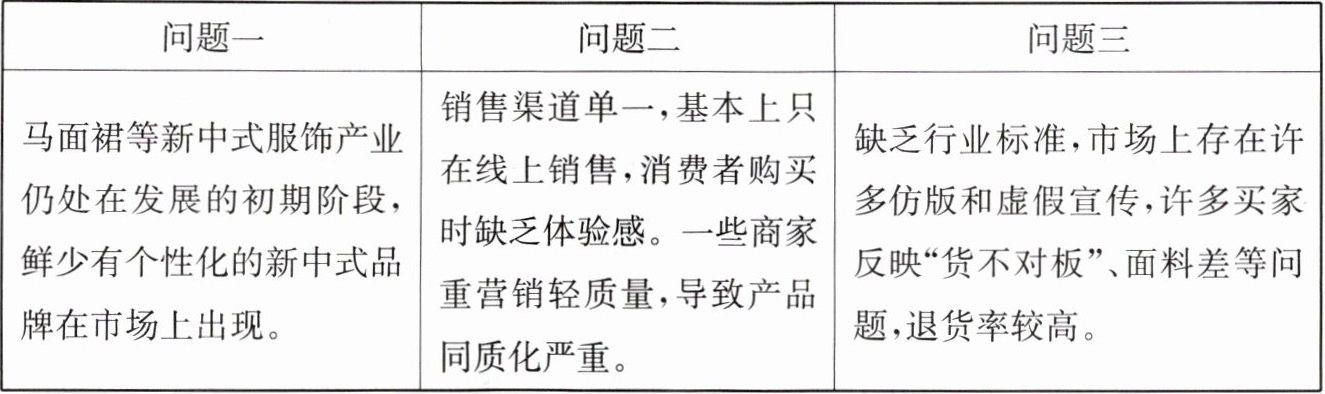 |马面裙等新中式服饰产业仍处在发展的初期阶段,鲜少有个性化的新中式品牌在市场上出现。|销售渠道单一,基本上只在线上销售,消费者购买时缺乏体验感。一些商家重营销轻质量,导致产品同质化严重。|缺乏行业标准,市场上存在许多仿版和虚假宣传,许多买家反映"货不对板"、面料差等问题,退货率较高。|