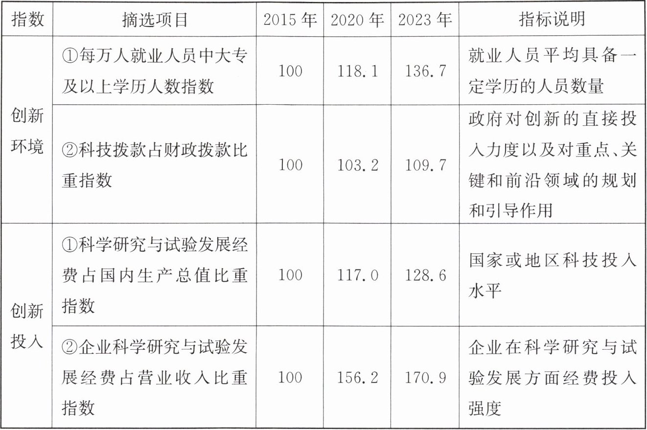 材料二 某班同学从国家统计局发布的2023年中国创新指数测算结果中摘选如下信息。(以2015年为100)。