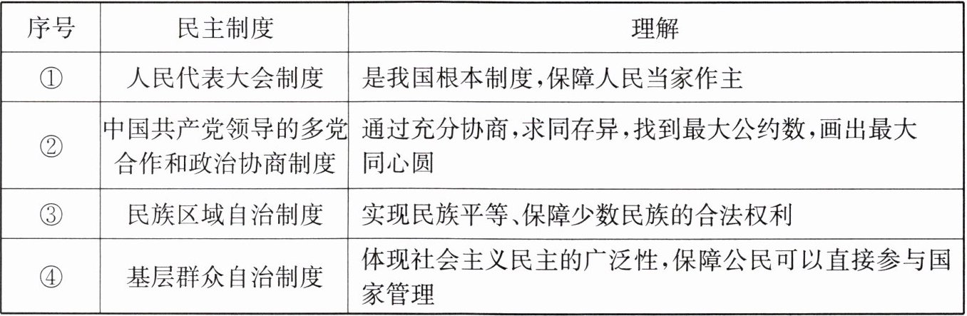 |①|人民代表大会制度|是我国根本制度,保障人民当家作主|