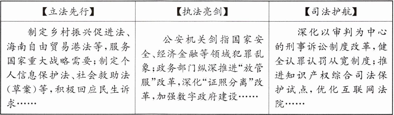 |制定乡村振兴促进法、海南自由贸易港法等,服务国家重大战略需要;制定个人信息保护法、社会救助法(草案)等,积极回应民生诉求……|公安机关剑指国家安全、经济金融等领域犯罪乱象;政务部门纵深推进“放管服”改革,深化“证照分离”改革,加强数字政府建设……|深化以审判为中心的刑事诉讼制度改革,健全认罪认罚从宽制度;推进知识产权综合司法保护试点,优化互联网法院……|