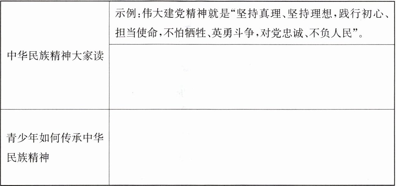 | 中华民族精神大家读 | 示例:伟大建党精神就是“坚持真理、坚持理想,践行初心、担当使命,不怕牺牲、英勇斗争,对党忠诚、不负人民”。 |