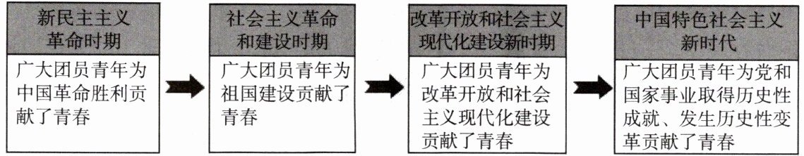 新民主主义革命时期广大团员青年为中国革命胜利贡献了青春→社会主义革命和建设时期广大团员青年为祖国建设贡献了青春→改革开放和社会主义现代化建设新时期广大团员青年为改革开放和社会主义现代化建设贡献了青春→中国特色社会主义新时代广大团员青年为党和国家事业取得历史性成就、发生历史性变革贡献了青春