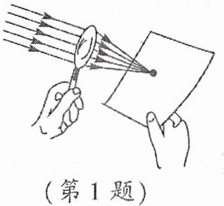 1. 如图所示,凸透镜正对着太阳光,来回移动另一侧的纸片,得到一个最小、最亮的光斑时,纸片距离凸透镜中心$10.0\ cm$,则此凸透镜的焦距是
