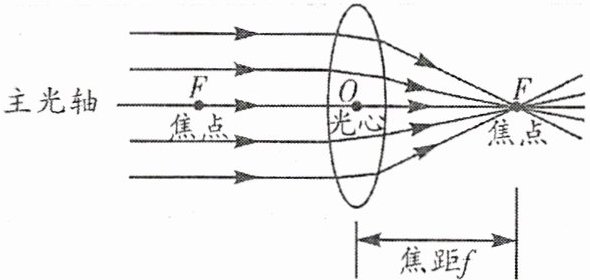 的距离称为焦距$(f)$。4. 测焦距的方法:让平行于主光轴的光透过凸透镜会聚于一点,用刻度尺测出此点到凸透镜光心的距离即为焦距。