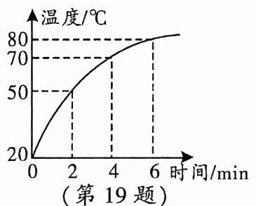 19. 天然气是一种洁净的能源,在公交车和出租车上推行以天然气代替汽油做燃料。某物理兴趣小组的同学,用天然气给8 kg的水加热,同时他们绘制了如图所示的加热过程中水温随时间变化的图线,若在4 min内完全燃烧了0.14 kg的天然气,天然气的热值约为$6×10^{7}\ J/kg$,则经过4 min时间加热,水所吸收的热量为