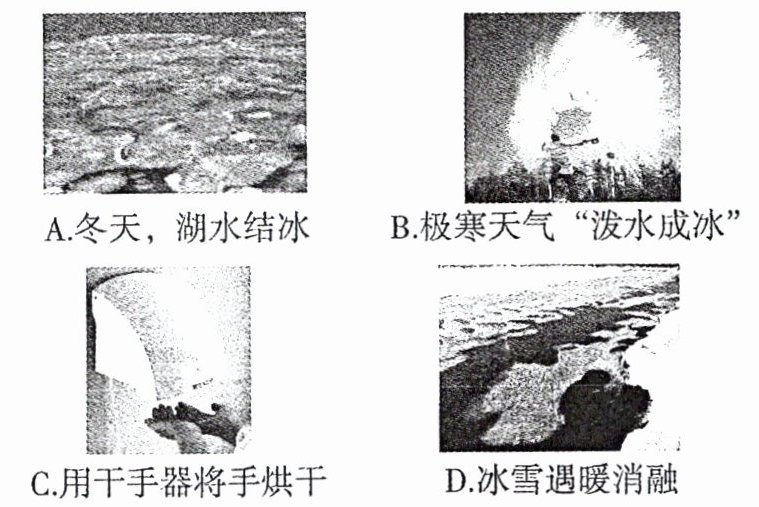 B选项:极寒天气“泼水成冰”,是液态水快速变为固态冰的过程,也属于凝固现象,不符合题意;