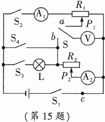 (3)解:闭合开关$S_1、S_2、S_4$,$S$接$a$处,电路为$R_1$滑片左侧部分与$R_2$并联,电流表$A_1$测$R_1$支路电流,$A_2$测$R_2$支路电流,$c$点电流为干路电流。