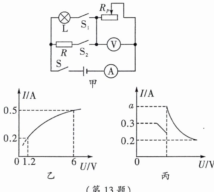 13.(2025·巴蜀)如图甲所示电路,电源电压恒定且大于$6\ V$,电压表量程$0~15\ V$,电流表量程$0~0.6\ A$,$R= 28\ \Omega$,小灯泡的正常工作电流为$0.5\ A$,其电流随电压的变化规律如图乙所示。闭合开关$S、S_1$,在保证电路安全的前提下,从最右端移动滑动变阻器的滑片至最小值处,此时电压表示数为$U_1$;保持滑片位置不变,再断开开关$S_1$,闭合开关$S_2$,继续调节滑动变阻器的阻值,使电压表示数再次为$U_1$;两次调节过程中电流表与电压表示数变化的关系如图丙所示。则$a$点的电流为